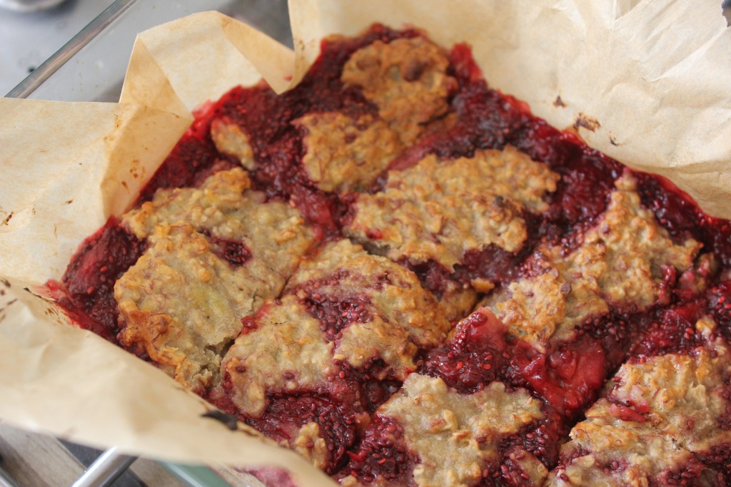 Last time I whipped them up I used a mix of blueberries, strawberries and raspberries and they were really tasty but this batch is purely strawberry which gives them a slightly sweeter taste. These bars are super easy and only have a few ingredients. The only taxing bit is making the jam and you can swap this out for shop bought jam if you’re not watching your sugar intake. Chia seed jam is surprisingly easy to make, it just takes a little time to cool. It’s a great idea to make it the day before you plan to whip up your Oat Bars but I always seem to forget!