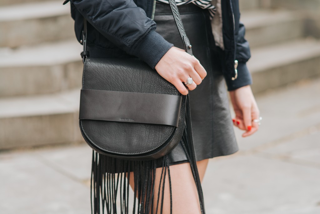 This leather skirt is one of my closet veterans. I say that because it’s been in my wardrobe for longer than two years which is a long stint as far as my clothes are concerned. This is because it’s amazing quality, the fit is spot on and it will never go out of style. This is the type of piece that you can easily dress up or play down and most of the time I play my denim down. This is a classic outfit for me. Navy + stripes + black + trainers = everyday uniform. It’s actually a shocker there’s no denim in sight!