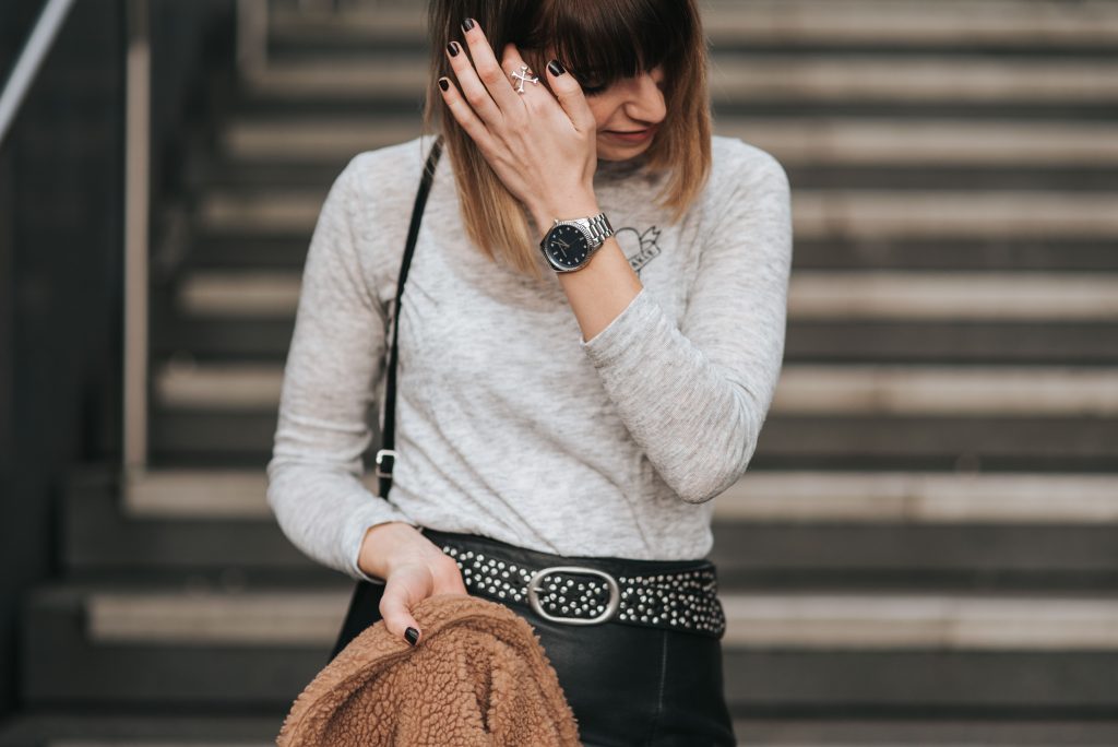On to the style talk. This Missguided jacket is my new favourite wardrobe addition, it’s just so cosy, actually really warm and I love the style of it. My skirt is from Warehouse years ago but this Fashion Union faux leather one is a great dupe. I’ve paired the skirt with essential tights and my high top Converse and accessorised with the cutest black mini bag and studded belt. It’s almost all ASOS everything except the jacket and trusty leather skirt but this is a standard outfit for me. I threw it on before work one morning last week and decided, actually, I’m loving this and I need to shoot it for the blog. That’s what I did.