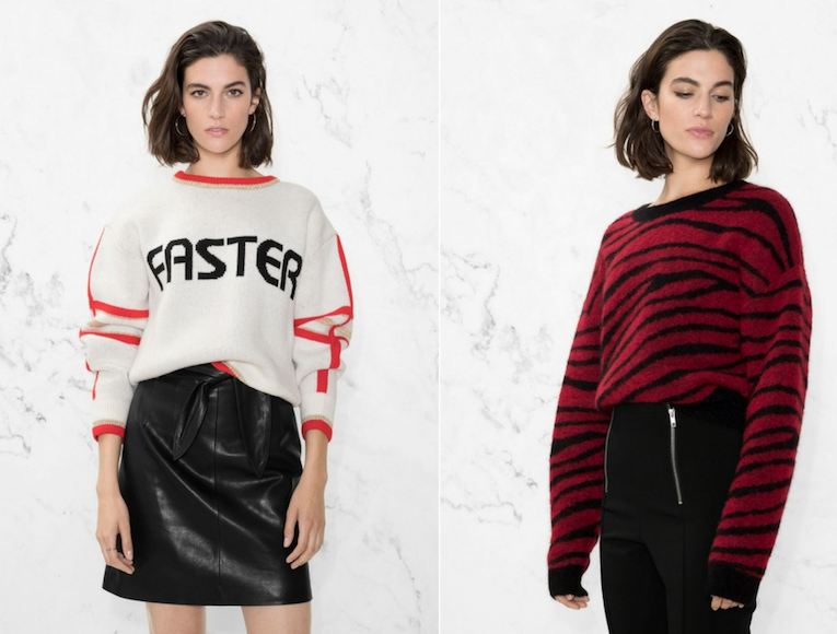 I love, love, love slogan sweatshirts so having a knitwear version is right up my street for A/W. This jacquard ‘FASTER’ slogan sweater is just gorgeous and looks fab with the leather mini that they’ve paired it with. Finally, this yellow zebra shoulder sweater has to be up there with a must have on my wish list. I wore yellow the other day for probably the first time and really liked it now I’m blonde!