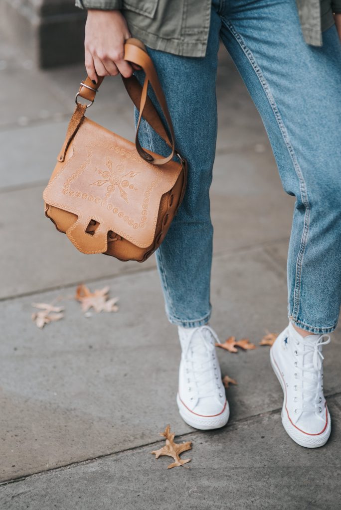 I’ve paired it here with my classic white high top Converse, Zara mom jeans, similar here from ASOS, my faithful khaki jacket from Primark and this vintage leather bag. This ASOS babe is quite similar if you like the vintage style.