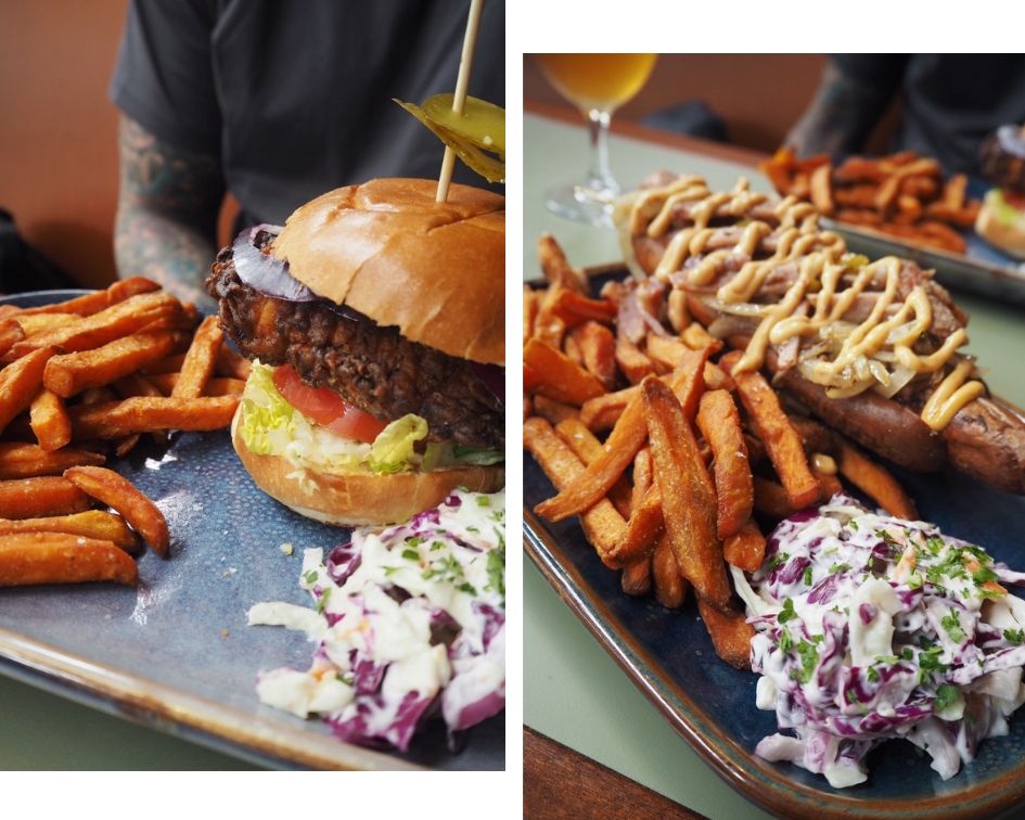 We went for the bacon-wrapped hotdog with chipotle mayo and jalapenos plus onions of course in an amazingly soft and perfectly chewy pretzel bun and the buttermilk fried chicken burger, topped with red onion, tomato, lettuce & peri peri mayo. We both had the sweet potato fries and they were really great.