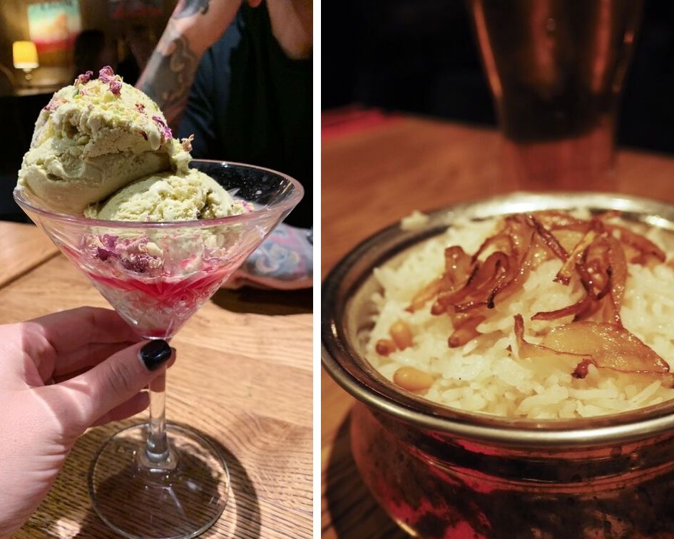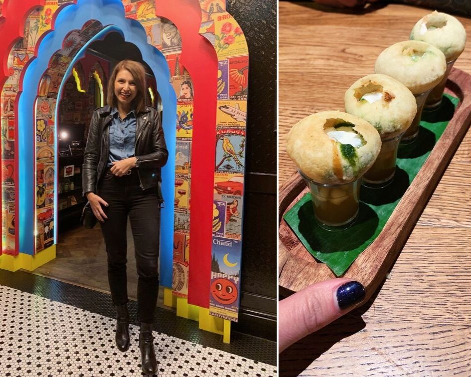 For dessert we tried the pistachio kulfi which was actually lovely and had such a strong pistachio flavour but, the dried rose petals on top and a strange stringy base made it all a bit strange. Another odd thing we had which, in all fairness the waitress told us was a love it or hate it thing were the Dahi Golgappa – a chatpata snack from Mumbai which are crispy puffed puris stuffed with potatoes, chickpeas & sweet, sour and spicy house chutneys but have a really strange texture when you bite into them as you have to put the whole thing in your mouth which is a bit unpleasant to be honest! Finally, I tried a cocktail that was very strong in terms of the vodka that was in it and just wasn’t to my personal taste but I think this was probably just me choosing something wrong.