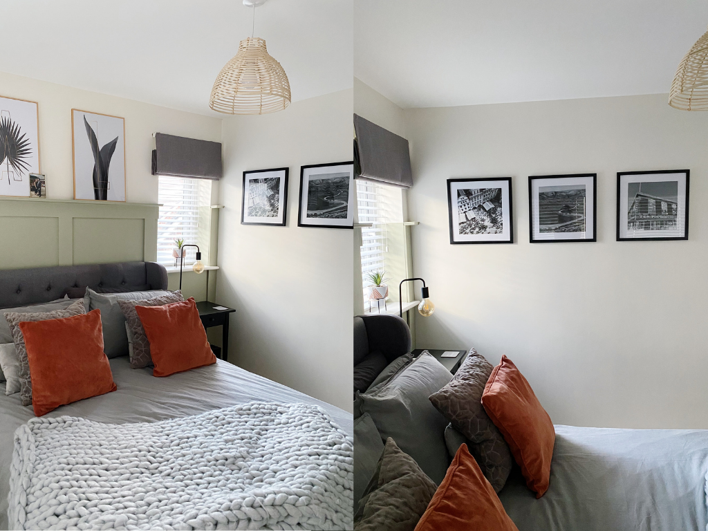 Our little master bedroom change up is complete! I chipped away at this for weeks during the third lockdown and it seemed to take me forever. The before is the Rightmove pic of course, as you’ll recognise our lamps, prints and the bed from our old bedroom and the right hand image is how we’re living with it now. I’m really happy so far, there’s a few tweaks and additional decorative bits to do but I’m much happier with the colour and the feel now.