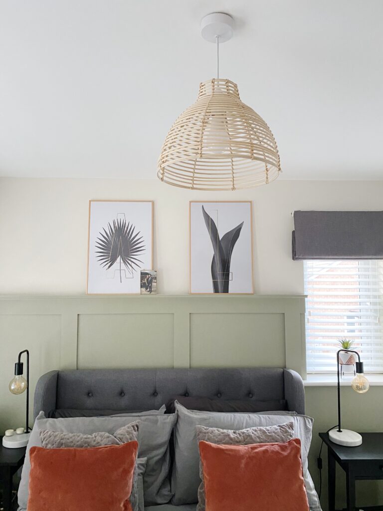 We wanted a calm and serene room with lots of soft furnishings and for it to feel cosy and relaxing. The purple and greys were too cold and I didn’t like them for a bedroom so I chose Overtly Olive for the panelling and Almond White (the same as in our bathrooms) from Dulux for the main walls. I wanted to contrast the green with a bit of copper so included some rust-coloured cushions from our old living room and some rose gold accents with photo frames.