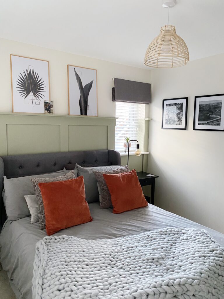 We wanted a calm and serene room with lots of soft furnishings and for it to feel cosy and relaxing. The purple and greys were too cold and I didn’t like them for a bedroom so I chose Overtly Olive for the panelling and Almond White (the same as in our bathrooms) from Dulux for the main walls. I wanted to contrast the green with a bit of copper so included some rust-coloured cushions from our old living room and some rose gold accents with photo frames.