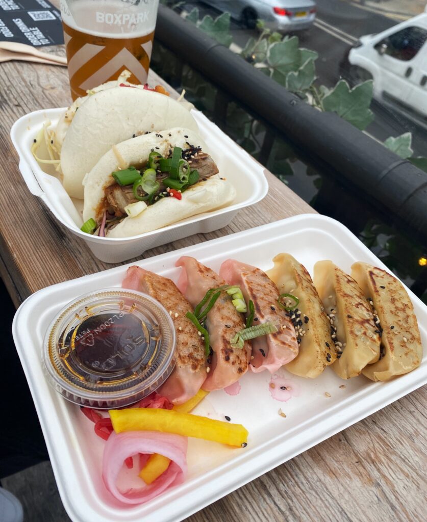 After a walk to BoxPark in Shoreditch we stopped for a walk around the pop up shops and some snacks as we had a big dinner planned that evening. We grabbed some bao buns – fried chicken and pork belly and some gyozas from Rainbo, a little Asian pop up at the top of BoxPark. The pork belly baos were our favourite and we’d definitely order these again.
